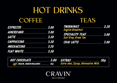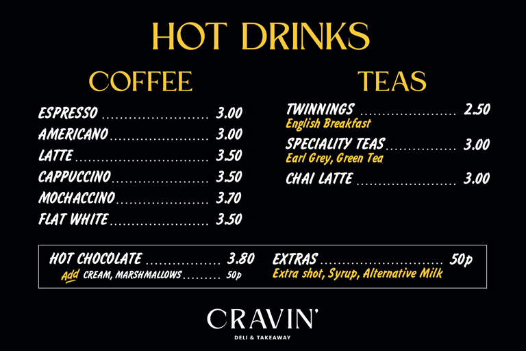 Great food deserves great drinks. At Cravin’, you can pair your meal with a freshly brewed coffee, speciality tea, or a comforting hot chocolate topped with cream and marshmallows.