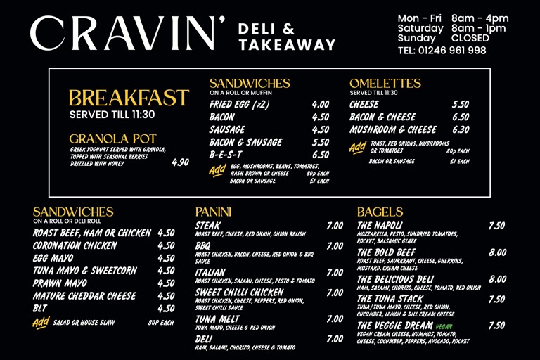 At Cravin' our food is all about fresh, honest ingredients and plenty of flavour. From hearty breakfasts to tasty lunches, everything is made to order and designed to satisfy.